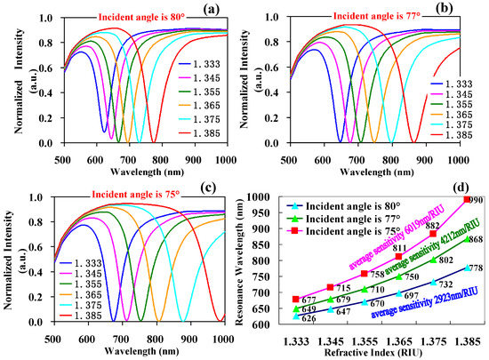 The simulation diagram of SPR signals with incident angles of (a) 80°, (b) 77°, and (c) 75°; (d) The corresponding resonance wavelength and average sensitivity of different incident angles under the detection range of the same refractive index.