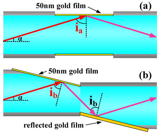 The SPR probe with an inclined structure on the vitreous-clad optic fiber is shown in Figure 2b. The structure was fabricated by butter-joint welding of two vitreous-clad multi-mode fibers with the same inclination angle of the ends. The inclined planes of the two fiber cores were respectively coated with a 50 nm gold film and a 300 nm reflection gold film. Seen in the figure, compared with the incident angle ia of the traditional multi-mode fiber with transmission structure, the incident angle ib between the main transmission mode of light and the gold film is smaller in the inclined structure of the vitreous-clad optic fiber. With an increase in the grinding angle of the incline plane, the incident angle was gradually reduced in order to realize the adjustment of the incident angle between the main mode of the light source and the gold film.