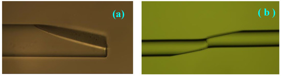 (a) Image of the vitreous-clad multi-mode fiber with a grinded tapered angle; (b) Image of a fused probe with an inclined plane structure.
