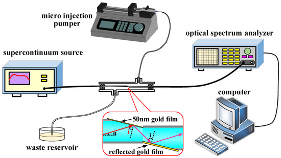 The experimental setup is shown in Figure 4. The SPR micro-sensing probe of the vitreous-clad multi-mode fiber with two inclined planes is sealed in the reaction pool. Glycerin aqueous solutions with different concentrations are prepared and the refractive index is calibrated by the Abbe refractometer (WYA-2W, Shanghai INESA, Physico optiacal Instrument Co., Ltd., Shanghai, China). The glycerin aqueous solution sample is injected into the reaction pool by a microinjection pumper (LSP01-1A, Baoding Longer Precision Pump Co., Ltd., Hebei, China) and after measurement, the waste liquid is discharged into the waste reservoir. A super continuum light source (SuperK compact, NKT Photonics, Birkerød, Denmark) is launched into the multi-mode fiber on the left of the probe. The propagating light produces total reflection on the first inclined plane and the SPR effect; the propagating light is reflected into the multi-mode fiber on the right on the second inclined plane. The light through the multi-mode fiber on the right is transmitted into the optical spectrum analyzer (AQ6373, Yokokawa, Tokyo, Japan), which collects the SPR attenuation spectrum to conduct data processing by the computer.