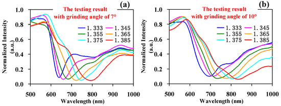 (3) According to the experimental data, with an increase in grinding angle (the decrease in incident angle) and an augmented half-width height of the resonance valley, the degradation of the SPR resonance valley curve is more severe. The phenomenon is worse in sample solutions with a high refractive index compared to sample solutions with a low refractive index. For example, the SPR attenuation spectrum testing curve with a refractive index of 1.385—shown in Figure 5a–d (red curve in the Figure)—represents the worst curve; it has a wider and more unapparent resonance valley and a more inaccurate resonance valley wavelength value with an increase in grinding angle.