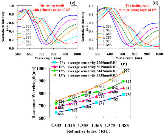 The SPR test results with grinding angles of (a) 7°, (b) 10°, (c) 13°, and (d) 15°. (e) The corresponding resonance wavelength and the average sensitivity of different grinding angles under the detection range of the same refractive index.