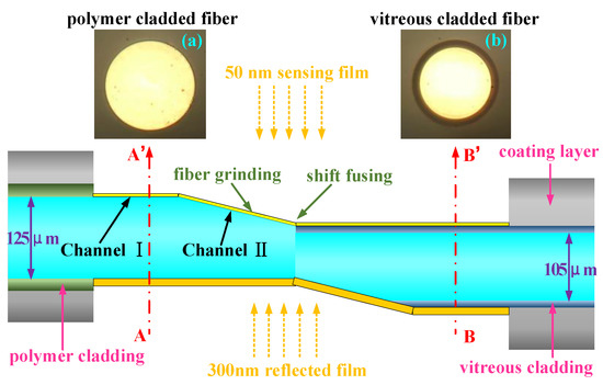 A schematic diagram of the dual-channel SPR sensing probe with the combined applications of the polymer- and vitreous-clad fibers. (a) Profile of the polymer-clad fiber; (b) profile of the vitreous-clad fiber.