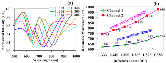 The test results of a dual-channel SPR sensor. (a) The test spectrum of the refractive index; (b) comparison of the dual-channel resonance wavelength and average sensitivity.