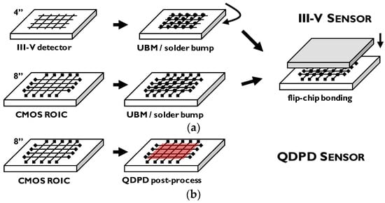 Integration route for a hybrid III–V infrared image sensor (a) and a monolithic quantum dot photodiode (QDPD) infrared image sensor (b).