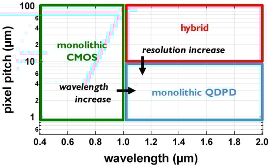 Positioning of a QDPD-based image sensor: higher wavelength than monolithic Si and higher resolution than hybrid alternatives.