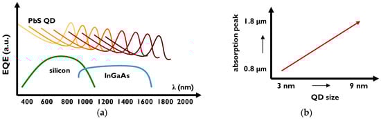 Schematic external quantum efficiency curves for silicon, InGaAs and PbS QD photodetectors (a) and indicative absorption peak dependence on quantum dot size (b).