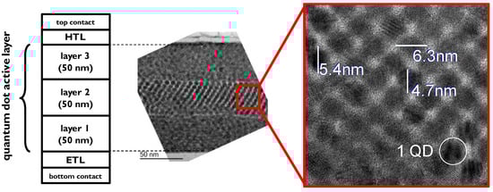 Cross-section (left: schematic; right: Transmission Electron Micrograph) of a 3-layer active stack based on 5.5 nm PbS quantum dots.