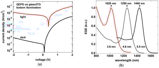 Current density vs. voltage of a bottom illuminated QDPD (a) and external quantum efficiency curves for different QD sizes used in the photoactive layer (b).