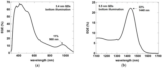External quantum efficiency of the quantum dot photodetectors extends over a wide range of wavelengths (above 300 nm) and then features a characteristic absorption peak related to the quantum dot size. In the bottom illumination architecture, we obtain 11% EQE at the wavelength of 980 nm for QDs with a diameter of 3.4 nm, with above 60% EQE between 350 nm and 500 nm (Figure 7a). For the larger QDs of 5.5 nm, the peak lies at 1440 nm, with EQE of 22% (Figure 7b). Taking the photodiode dark current as the major noise component, we can obtain specific detectivity (D*) of 3 × 1011 Jones.