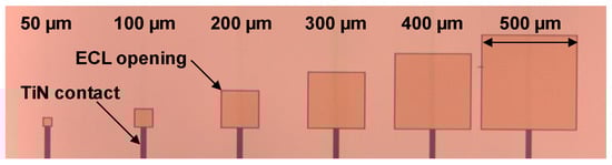 Microscope image of the silicon substrate with different pixel sizes showing TiN bottom contact and inorganic edge cover layer.