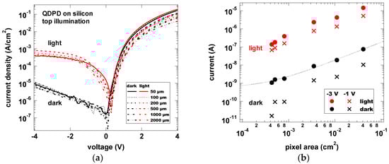 Dark and photocurrent density vs. voltage curves (a); and current vs. pixel area curves (b) for active areas between 50 × 50 μm2 and 2 × 2 mm2.