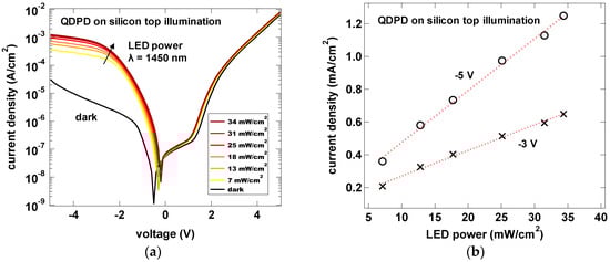 Current density—voltage characteristics (a) of a QDPD on Si substrate in dark (black line) and under 1450 nm IR LED with varying power (color lines); and linearity curve of the photocurrent density (b).