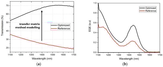 Top illuminated photodetector stack optimized for NIR transparency: Improvement of the top contact transparency (a); and experimental EQE verification (b).