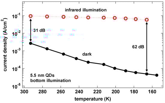 Even though PbS QDPDs enable detection at room temperature, standard IR camera packaging offers possibility of additional cooling. In the cryostat measurements, we observed that by cooling the detector to 193 K we can further improve the current ratio to over 60 dB from 30 dB at room temperature (Figure 12). Depending on the application, this might be a way to boost the sensitivity of the image sensor.
