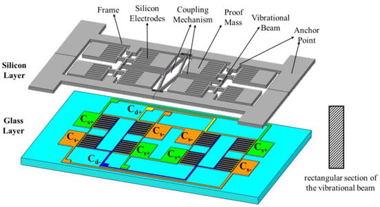 The proposed quad differential butterfly gyroscope consists of two layers: a main sensitive silicon structure and a glass substrate which is bonded onto a silicon layer through the anchor point. All the metal electrodes were fabricated on the glass layer, and there is a gap between the metal electrodes in the glass and silicon structures. As depicted in Figure 1, the silicon structure is made from a 240 µm thick crystalline silicon wafer and consists of eight proof masses, two main vibrational beams, a frame, silicon electrodes with a comb structure, and a coupling mechanism. The coupling mechanism serves its aim to connect two single butterfly gyroscopes together and achieves mode ordering that separates the in- and anti-phase driving mode frequencies.