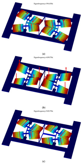 As has been mentioned above, the in-phase driving mode has to be avoided to decrease the effects of external vibration and disturbance, thus a large frequency separation between the in- and anti-phase modes is needed [22,23]. However, a high driving mode frequency will reversely result in a low scale factor of gyroscope. Therefore, an improved mode ordering that makes the frequency of in-phase driving much higher than anti-phase driving is necessary and will potentially enhance the performance of the gyroscope. The proposed design shows that the frequency of these three modes are driving mode with 3914.5 Hz, sensing mode with 4190.7 Hz, and disturbing mode with 5103.7 Hz. It can be seen from this results that the coupling mechanism successfully separates the two driving modes.