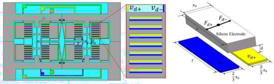 In order to achieve a tangential driving force, a type of electrode with a comb structure was designed on the mass of the silicon structure and the corresponding electrodes were designed on the glass layer to generate a tangential driving force. When the vibration structure is not totally aligned with glass plate, it will produce tangential electrostatic forces, as shown in Figure 3.