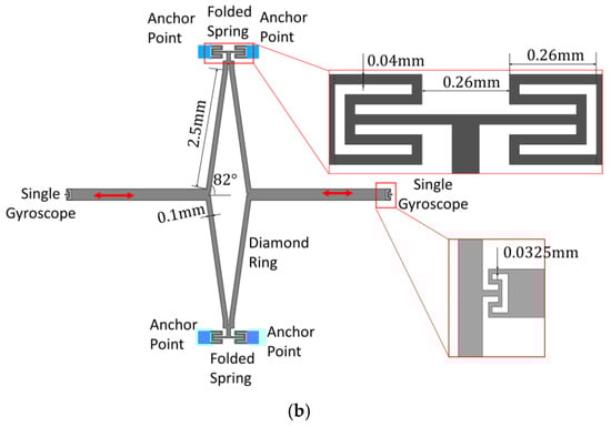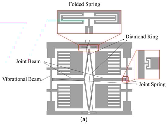 As mentioned before, an improved mode ordering that shifts the frequency of in-phase driving much higher than the anti-phase driving frequency is necessary. In this proposed structure, it is achieved by novel coupling mechanism, as depicted in Figure 4a, which is composed of a diamond ring, two folded springs embedded in the frame, two joint beams, and two joint springs connecting to the vibrational beams. Figure 4b shows the main size of the adopted mechanism in this research.