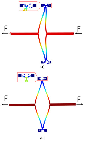 The frequency separation is realized through different stiffnesses of the coupling mechanism in in- and anti-phase driving motion, therefore it is necessary to analyze the stiffness of this mechanism in different conditions. Because of the complexity of the theoretical arithmetic of this complicated structure, finite element method (FEM) simulation by COMSOL Multiphysics is utilized to simulate structure deformation when the mechanism works in different situations. As is shown in Figure 5, two equal forces are applied to the end of the joint springs to simulate the real conditions in driving mode. The two forces are in opposite directions in anti-phase driving and in the same direction in in-phase driving. Supposing the displacement of the end is , the stiffness of this mechanism can then be calculated as: