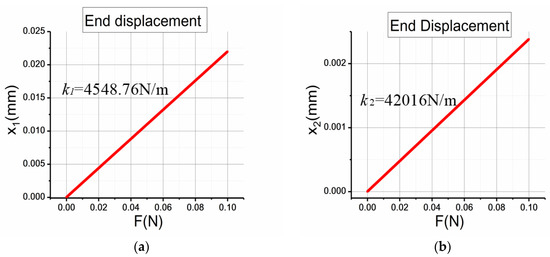 By applying different forces and calculating different displacements in COMSOL, the relationship between applied force and generated displacement is obtained and the stiffnesses of two conditions is depicted in Figure 6. It can be seen that the displacement of the end shows a linear relationship with the applied force. More importantly, the stiffness of the mechanism working in in-phase driving mode is much higher than that in anti-phase driving mode (about 10 times higher), which demonstrates that the proposed mechanism can achieve the goal of enlarging the stiffness of the in-phase driving mode and lowering the stiffness of the anti-phase mode.