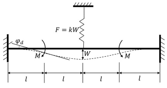 The silicon structure is fully symmetrical and it has been verified that the mechanism can be treated as a spring in terms of the liner relationship between applied force and generated displacement. To simplify the analysis, the main vibrational beam can be regarded as a clamped-clamped beam with a length of , as depicted in Figure 7. The coupling mechanism is simplified to a spring with a stiffness of that acts at the midpoint of the beam, and the generated elastic force can be defined as