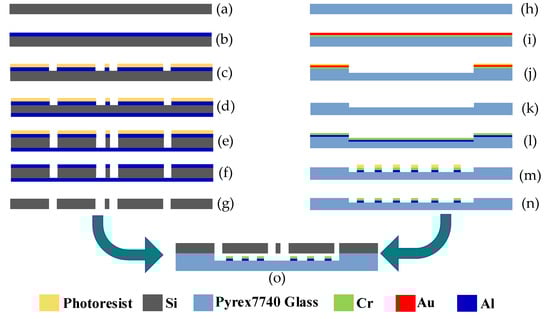 In the silicon fabrication process, metal Al was used as the etching mask for DRIE for its extremely high selection ratio in DRIE, and it was also used in the back side of the silicon substrate during DRIE to avoid the universal “notching effect” [27]. In the process on the glass substrate, a Cr and Au layer was used as the mask for glass etching in buffered oxide etch (BOE) solution due to their high resistance when etched. When bonding the two layers together using anodic bonding, the high voltage applied to the two sides may lead to electrostatic adhesion failure. To avoid this failure, a layer of Cr was deposited on the front of the Al because it will not form a chemical bond in anodic bonding.