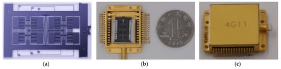 As was shown in Figure 9a, the bonded structure was then scribed using a tense-energy laser. The single gyroscope has dimensions of 10 mm × 18 mm. There are two diving electrode pads and four sensing electrode pads in the glass, and the silicon layer was connected to the ground. Single chips were then wire-bonded to package (Figure 9b). Finally, the package was vacuum-sealed under a pressure of (Figure 9c).