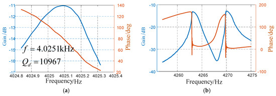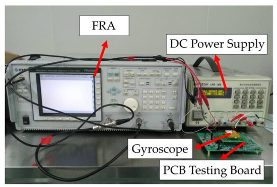 The micro-gyroscope was firstly tested using a frequency response analyzer (NF FRA 5087, NF Corporation, Yokohama, Japan), DC-regulated power, and a model testing PCB board. The setup is shown in Figure 10. The test results are shown in Figure 11. In driving direction, the resonance frequency in anti-phase was 4025.1 Hz, and it can reach a Q-factor of 10,967 in this mode.