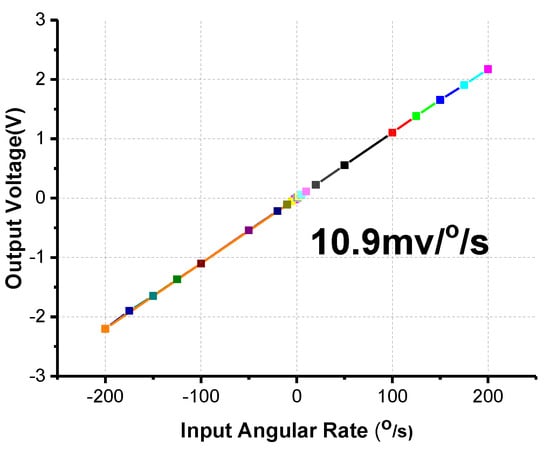 The scale factor is an important specification representing the ratio of a change in output to a change in the input angular rate. Under ambient temperature conditions, the fabricated gyroscope prototype was fixed on a precise rotating platform. A stable output was obtained over a range of angular rates, as shown in Figure 12. The scale factor of the fabricated gyroscope reached approximately 10.9 mV/°/s, and showed a measurement range of ±200°/s, and the scale factor nonlinearity is 1221 ppm.