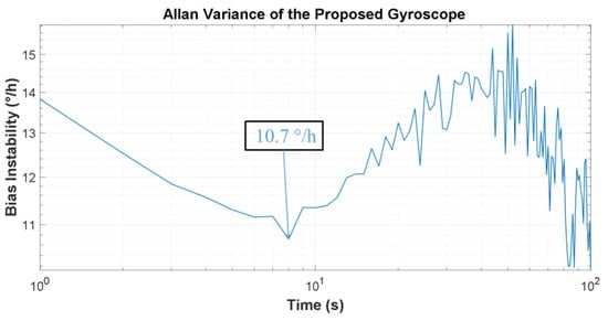 Bias instability is another critical specification in gyroscope performance, referring to the output of the gyro at zero-angle input. A 1 h static test was performed at room temperature. The Allan variance was used to characterize the bias instability. The standard definition of bias instability used by inertial sensor manufacturers is the minimum point on the Allan variance curve (Figure 13). It can be calculated from the results that the bias instability is 10.7°/h.