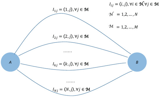In this paper, we introduce a typical user scenario for RIF to work with, which is shown in Figure 1. Then, the problem formulation is presented based on this scenario. In Figure 1, there are two traffic points A and B connected by N candidate routes grouped as . Travellers at one time can travel in one of the routes from group using one of the M possible modalities, e.g., foot, cycle, car, bus, etc., from group . For a travel route i, its traffic volume is composed of its incoming travellers and existing traffic , and the maximal capacity of the route i is denoted as . In practice, through RIF, a traveller t with specific travel route and modality preferences could compete for the available capacity resources within the candidate routes from while using a specific modality from between traffic points A and B.