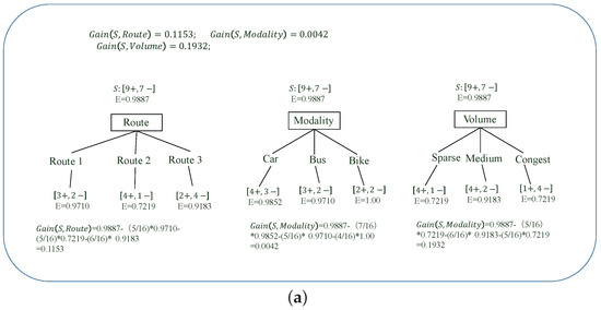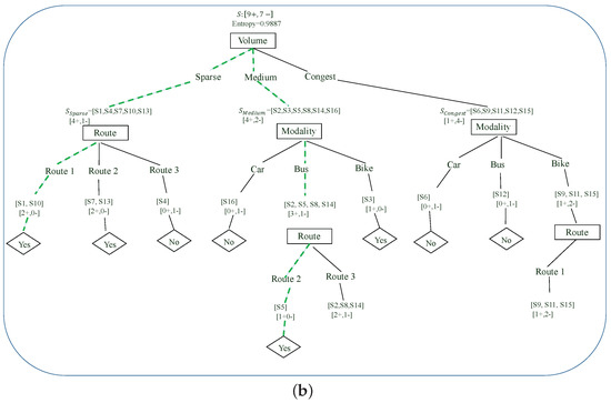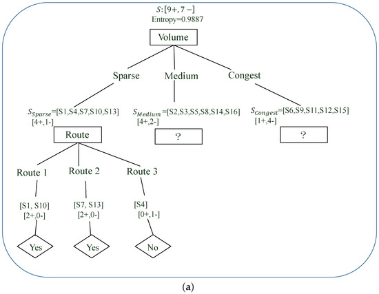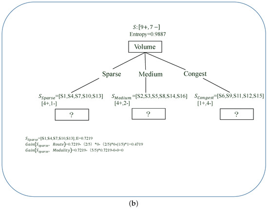 According to the definition of entropy and information gain, we can carry out ID3 to build the incentive decision tree through a recursive method. Specifically, at the beginning of the ID3 algorithm, the information gain of each incentive criteria to group S can be calculated according to Equation (9), which is shown in Figure 2a. Based on this information gain, obviously the route volume incentive criterion should be picked as the best fit decisional incentive criterion to classify group S at the first node, as shown in Figure 2b. This is because the route volume incentive criterion has the highest information gain, i.e., 0.1932 compared to the route and modality incentive criterion. For the route volume incentive criterion, group S is then classified into three sub-groups, i.e., and , each of which co-relates to one of the optional values of the route volume incentive criterion, i.e., , and , as shown in Figure 2b. In the next step, ID3 has to decide the next incentive criterion to further classify each of those sub-groups. As shown in Figure 3a, for group , it has to decide which as yet unprocessed incentive criterion, i.e., modality or route, is to be put forward at the following node to further classify . In order to do so, ID3 has to recursively carry out the same procedure as for group S to pick the un-processed incentive criterion with the highest information gain to be the next decisional incentive criterion of group . For example, in Figure 3a, the route incentive criterion which has the highest information gain is put at the following node of . Then, is further classified into three sub-groups co-relating to the three optional values of the route incentive criterion, i.e., Routes 1, 2 and 3. The recursive procedure is also carried out for sub-group and to further classify their sample data.