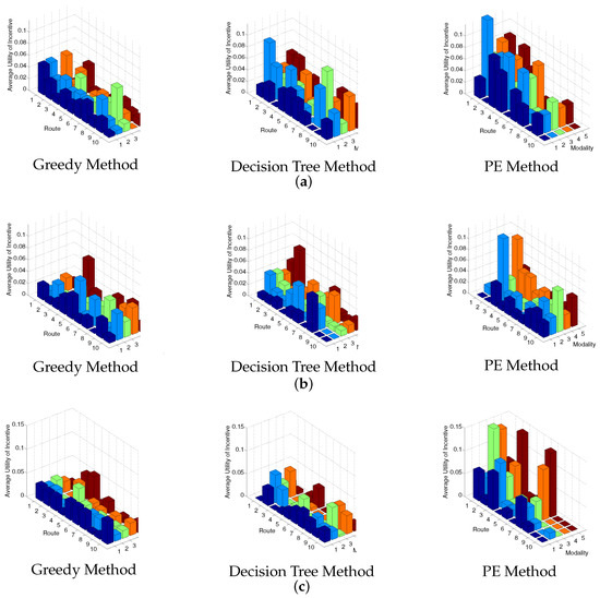 Comparisons of the average utility of incentive using different methods. (a) Traveller Scenario 1; (b) Traveller Scenario 2; (c) Traveller Scenario 3.