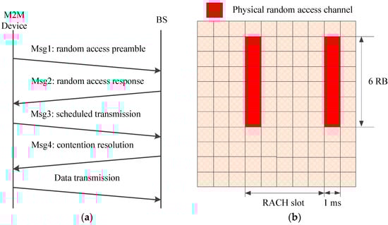 A simplified model of the random access procedure in LTE/LTE-A networks is depicted in Figure 1a, which shows that four handshake messages are needed before a successful data transmission [10]. If two or more devices select the same preamble in Msg1, they will receive the same random access response (RAR) message from the base station (BS) and then send Msg3 on the same granted uplink channel. However, the BS cannot decode the superposed Msg3 accurately. Hence the colliding devices fail in this random access attempt and would send retransmission requests on the next random access channel (RACH). As a result, the main concern of most works is the RACH congestion problem caused by simultaneous random access requests from massive devices [11,12,13,14,15,16]. The existing overload control mechanisms can be classified as push-based schemes (such as access class barring (ACB), dynamic RACH resources allocation, backoff, and slotted access), pull-based scheme (group paging) and a combination of these methods.