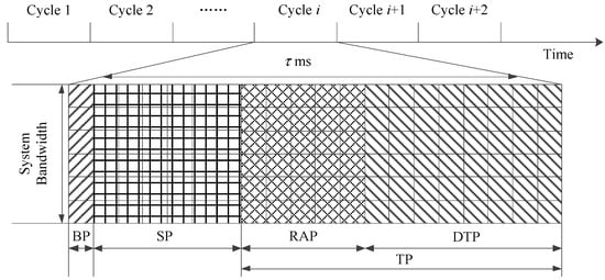 In order to utilize the resources more efficiently, the HSTMAC protocol mainly divides the reserved resources into three sections: broadcast period (BP) for essential downlink control information, S-ALOHA period (SP) for M2M traffic with small size packets and TDMA period (TP) for H2H traffic with large size packets. The TDMA period is further split into random access period (RAP) for contention based random access and data transmission period (DTP) for contention free packet transmission. The optimal tradeoff between RAP and DTP is made according to Equation (4).