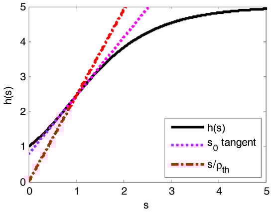 Obviously, the solutions for Equation (35) are the cross points of line s/ρ and curve h(s). Function h(s) has exactly one convex piece on (0,s0) and one concave piece on (s0,+∞) for Q ≥ 1. Especially for Q ≤ 8, there is only a single solution for Equation (35) on (0,+∞) (the proof is not a contribution of this paper, readers may refer to [44] for more details). Apparently, s/ρth has a cross point with h(s) at point s = 1. Therefore, as shown in Figure 3, there must be precisely a single equilibrium point on (0,1) if ρ < ρth. On the other hand, there must be precisely a single solution for Equation (35) on (1,+∞) if ρ > ρth, which means that the system is in a saturation state.