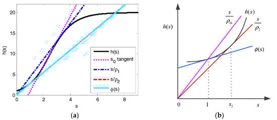 For Q ≥ 9, there are two load boundaries 0 < ρ1 < ρ2 < ∞. Actually, as shown in Figure 4a, s/ρ1 is the tangent of h(s) on (s0,+∞) and s/ρ2 is the tangent of h(s) on (0,s0). Let s2 denote the point of tangency of s/ρ2 and h(s), we can derive that: