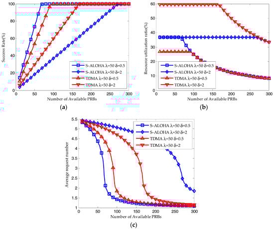 Shown in Figure 5, the system performance of S-ALOHA and TDMA protocols with different packet size are derived by the iterative method. For small packet size δ = 0.5, as shown in Figure 5a,b, when the available resource blocks are insufficient, both the average success probability and resource utilization ratio of S-ALOHA protocol is higher than that of TDMA protocol. At the same time, as shown in Figure 5c, the average request number of S-ALOHA protocol is lower than that of TDMA protocol. When the number of available resource blocks is large enough, the success probability and resource utilization ratio of S-ALOHA protocol are almost the same with that of TDMA protocol while the average request number of S-ALOHA protocol is still lower than that of TDMA protocol. For large packet size δ = 2, on the contrary, when the available resource blocks are insufficient, both the average success probability and resource utilization ratio of S-ALOHA protocol is lower than that of TDMA protocol and the average request number of S-ALOHA protocol is higher than that of TDMA protocol. When the number of available resource blocks is large enough, the success probability and resource utilization ratio of S-ALOHA protocol are almost the same with that of TDMA protocol while the average request number of S-ALOHA protocol is still higher than that of TDMA protocol. Therefore, we can validate the analysis in Section 3.1 and make a conclusion that the S-ALOHA protocol is superior to the TDMA protocol for small packet transmission while the TDMA protocol is superior to the S-ALOHA protocol for large packet transmission.