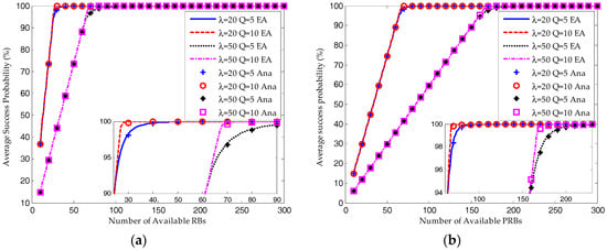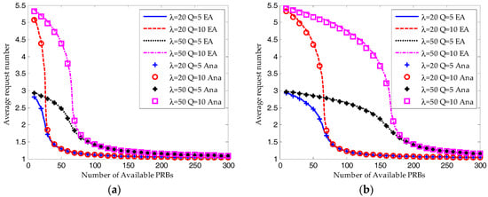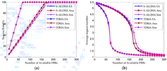 As shown in Figure 7 and Figure 8, when the available RBs are insufficient, the ACB scheme would ensure the system converges to a saturated equilibrium state. Then according to Equations (44) and (48), for both the S-ALOHA and TDMA protocols, the average success probability is increasing linearly with the number of available RBs and the resource utilization ratio remains constant. The transmission limit has no impact on the success probability and resource utilization ratio under such a condition. However, as shown in Figure 8, the average request number for Q = 10 is much higher than that for Q = 5.