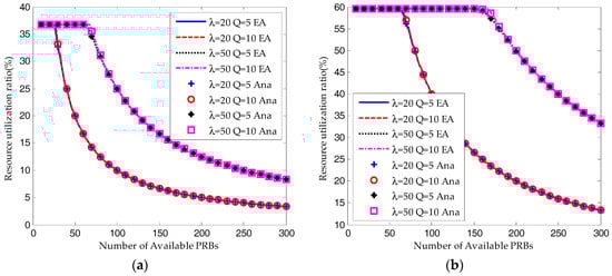 When the number of RBs is large enough, almost all the devices can succeed in their transmission attempts. However, the resource utilization ratio is decreasing due to the underutilization of RBs. On the other hand, as shown in Figure 7, Figure 8 and Figure 9, the performance results for Q = 10 and Q = 5 are almost the same.