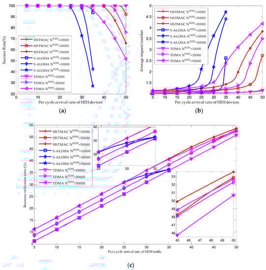 Apparently, Figure 10 shows that the average success probability and resource utilization ratio of the proposed HSTMAC protocol are always higher than that of S-ALOHA and TDMA protocols while the average request number is always lower than that of S-ALOHA and TDMA protocols. The reason is that S-ALOHA is appropriate for small size packet transmission while TDMA is appropriate for large size packet transmission. In order to satisfy the QoS requirement of H2H traffic, the number of reserved RBs for H2H traffic in S-ALOHA protocol is much higher than that in TDMA protocol. As shown in Figure 10, for a high H2H traffic load in the S-ALOHA protocol, the QoS cannot be satisfied even if H2H traffic occupies all the RBs. Therefore, comparing the HSTMAC protocol to the TDMA protocol, the number of reserved RBs for M2M traffic are the same. However, comparing the HSTMAC protocol to the S-ALOHA protocol, the number of reserved resource blocks for M2M traffic is much higher. As a result, the proposed HSTMAC protocol is superior to the pure TDMA protocol and pure S-ALOHA protocol especially in a high system load scenario.