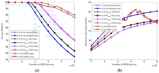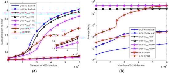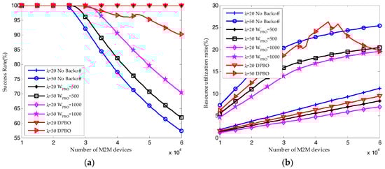 When the arrival rate of H2H packets is λ = 20, the reserved RBs are sufficient to satisfy the QoS requirement of M2M traffic. Shown in Figure 12a, almost all the M2M devices can send their packets successfully, and the resource utilization ratio of M2M traffic shown in Figure 12b is increasing linearly with the number of M2M devices. Under this condition, the pre-backoff window size in DPBO algorithm would remain close to zero. The time interval Imax is increasing with the pre-backoff and backoff window size. Hence, as shown in Figure 10 and Figure 11, the resource utilization ratio and the average request number in the DPBO algorithm is higher while the average delay is much lower than that in the UPBO algorithm.