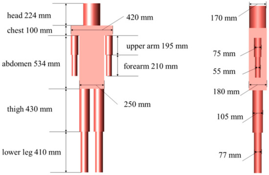 In this work, an inhomogeneous human body model, which consists of head, chest, abdomen, upper arm, forearm, thigh, and lower leg, was proposed to explore the propagation characteristics when the human body was used as an antenna. As shown in Figure 1, the height of the human body model was 1698 mm, which corresponded with the average height of an adult [22].The tissue layers and thicknesses of different body parts in this model are listed in Table 1 [23].