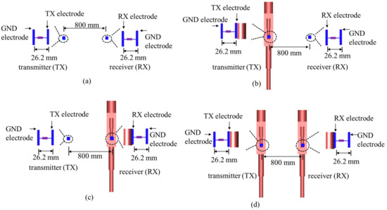 The simulation setup of four scenarios: (a) Scenario 1: TX electrode without human body, RX electrode without human body; (b) Scenario 2: TX electrode with human body, RX electrode without human body; (c) Scenario 3: TX electrode without human body, RX electrode with human body; (d) Scenario 4: TX electrode with human body, RX electrode with human body.