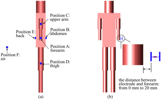 (a) Simulation setup about the positions of electrode; (b) simulation setup about the distance between electrode and human body.