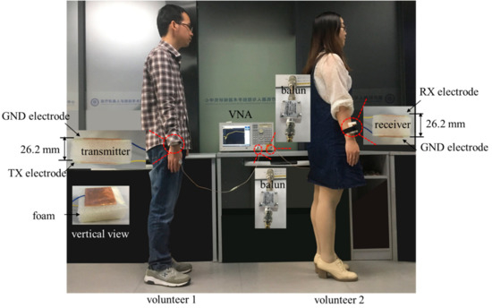 To verify the validity of numerical simulations with an inhomogeneous human body model, experiment measurements were executed in this paper. Written informed consent was obtained from the volunteer before the measurement. As shown in Figure 4, two volunteers stood on the floor, and the distance between the volunteers was consistent with the simulation setup. The TX electrode, RX electrode, GND electrodes were fabricated by the copper. The distance between TX electrode/RX electrode and GND electrode was about 26.2 mm. The TX electrode of transmitter was attached on the forearm of volunteer 1 by the wristband, and the GND electrode of transmitter was exposed to the air. Furthermore, the transmitter was connected to the Port 1 of vector network analyzer (VNA, model number: E5061A, Agilent, CA, USA) by the cable and balun transformer with turn ratio of 1:1 (model number: FTB-1-1, Mini-Circuits, NY, USA). Similarly, the receiver was attached to volunteer 2 and connected to the Port 2 of VNA. The balun transformers were adopted in the experimental measurement for the reason that it could break the connection between the GND electrodes of transmitter and receiver [24,25], which corresponded to the simulation setup. The channel gain between transmitter and receiver was acquired by the VNA at four aforementioned scenarios in the frequency range 1 MHz to 90 MHz. Subsequently, the position of the transmitter or receiver was changed, and the channel gain was obtained at 44 MHz. Finally, the influence of the distance between electrode and human body was measured by the VNA at 44 MHz.