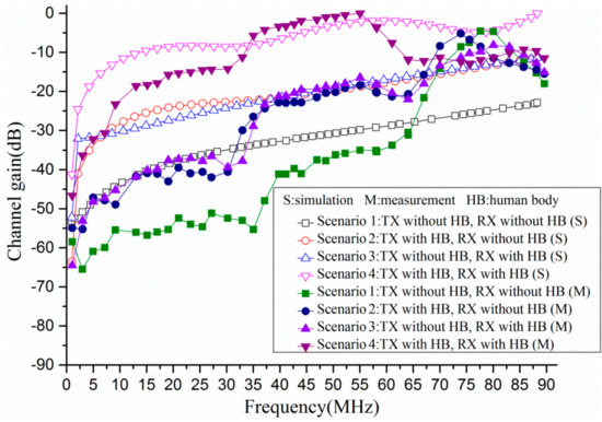 On the other hand, as demonstrated in Figure 5, the channel gain of Scenario 2 and Scenario 3 was almost the same in the frequency range 1 MHz to 90 MHz, which might be explained by the reciprocity theorem of antenna [30,31]. According to the reciprocity theorem, the characteristics remain the same when an antenna is used for transmitting signal or receiving signal under the conduction that the antenna is not nonlinear material. Due to the fact that the human tissues are linear material, the propagation characteristics were similar when the human body was used as a transmitting antenna in Scenario 2 and used as a receiving antenna in Scenario 3.