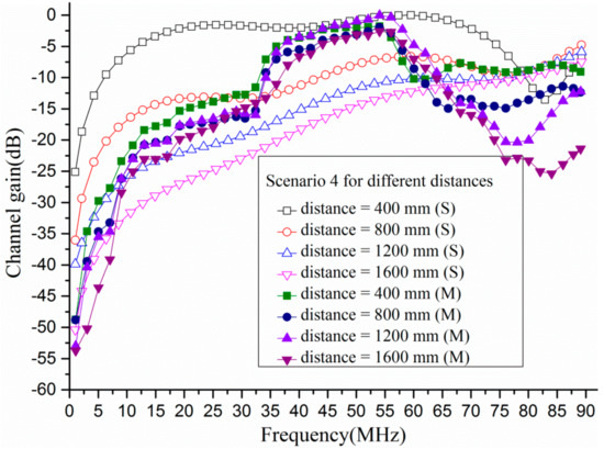 Figure 6 shows the channel gain (in dB) of different distances (i.e., 400 mm, 800 mm, 1200 mm, 1600 mm) between transmitter and receiver at Scenario 4 when the frequency was from 1 MHz to 90 MHz. The simulation results and measurement results were also pre-processed by the aforementioned method. In terms of simulation results, it could be observed that as the distance between transmitter and receiver increased, the channel gain was decreased when the frequency was below 80 MHz. On the other hand, it was found that when the distance was beyond 800 mm, the difference of channel gain among different distances became small. For instance, the channel gain was more than −1.58 dB at 44 MHz when the distance was 400 mm. However, the channel gain was −9.77 dB, −13.39 dB, −16.01 dB respectively at 44 MHz when the distance was 800 mm, 1200 mm, 1600 mm. Thus, the distance between transmitter and receiver was taken as 800 mm in this paper.