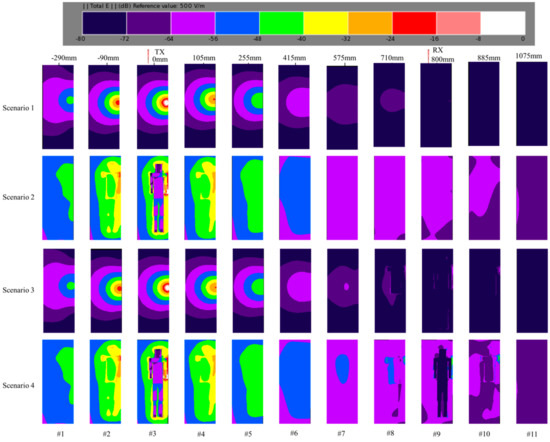 To intuitively analyze and compare the performances of four scenarios, the electric field distribution was studied in this section. Figure 7 demonstrates the electric field distribution of different distances for four scenarios when the frequency was 44 MHz. The original point (0 mm) was set as the position of transmitter. The distance from transmitter to receiver was 800 mm. The reference value of electric field intensity (EFI) was 500 V/m (i.e., 0 dB). As shown in the 3rd frame of Scenario 1, the EFI of TX electrode was approximately −20 dB, and the EFI near the TX electrode was from −32 dB to −64 dB. As the distance increased, the EFI decreased gradually. The EFI was from −72 dB to −76 dB when the distance was 800 mm. Moreover, the EFI declined to −80 dB at the distance of 1075 mm. Different from the electric field distribution in Scenario 1, the EFI of Scenario 2 in the 3rd frame was from −8 dB to −56 dB. Meanwhile, it could be observed that the EFI was almost the same when the distance was −90 mm and 105 mm. In addition, the EFI was quite similar when the distance was −290 mm and 25 mm. Thus, it was inferred that the power which is radiated out of the human body was omnidirectional. Compared with Scenario 1, the EFI was more than −56 dB when the distance was 800 mm, which indicated that the human body could be considered an effective transmitting antenna. On the other hand, it was interesting to observe that the electric field distribution of Scenario 3 was quite similar to Scenario 1 when the distance was below 415 mm, which was because both the TX electrodes of Scenario 1 and Scenario 3 were not attached to the human body. However, the EFI of Scenario 3 was greater than Scenario 1 when the distance was over 710 mm, which might be caused by the effect of the human body. As shown in the 8th, 9th and 10th frame of Scenario 3, the EFI around the human body was mainly from −56 dB to −80 dB. The electric field distribution of Scenario 4 was almost the same as Scenario 2 when the distance was below 415 mm. Because of the influence of the human body on the RX electrode, the EFI of Scenario 4 was greater than Scenario 2 when the distance was over 575 mm. The EFI of Scenario 4 was from −40 dB to −64 dB when the distance was 800 mm. Therefore, to sum up, the EFI is prominently enhanced when the TX electrode and RX electrode are attached to the human body.